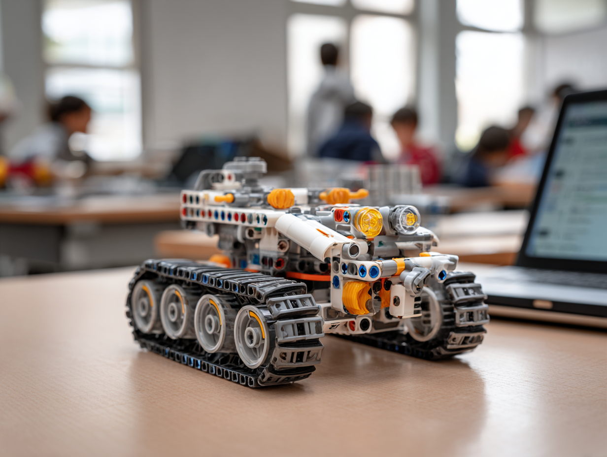 Schüler:innen programmieren mit Software von Lego Mindstorms mobile Roboter. Ziel des Workshops ist die Realisierung eines „Putzroboters“, der autonom durch einen Testparcours im Klassenzimmer fährt und Hindernissen ausweichen kann.